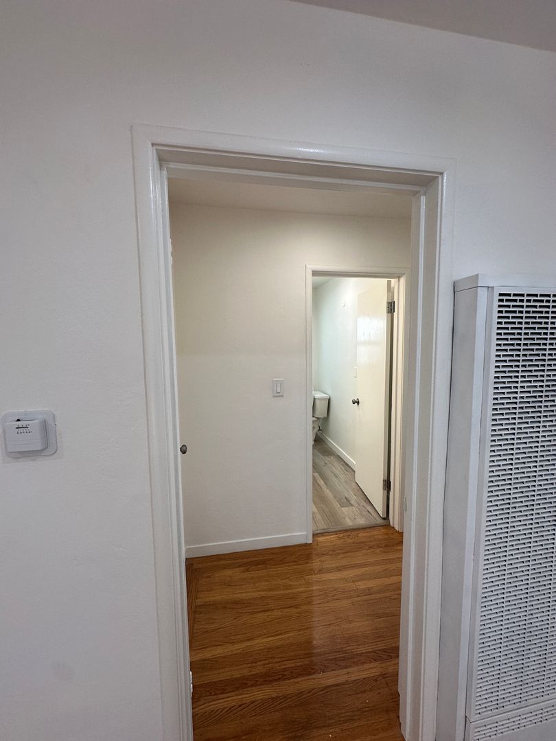 The bedroom is properly separated from the living space, and closet space is generous for a one-bedroom.